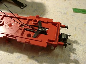 Das rote Kabel verbindet übrigens den Rauchsatz mit dem F1-Ausgang. Die Federplatten entferne ich üblicherweise, weil der Kontakt zu unsicher ist. Der Lokaufbau kann wieder aufgesetzt und verschraubt werden, nachdem die zusätzlichen Kabel Für F1, F2 und Orange nach hinten gezogen sind. |