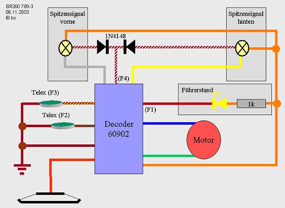 €60. Weil meine Anlage digital gesteuert wird und seit kurzem auch für den Motor mit dem kleinen Scheibenkollektor (SFCM) ein Umrüstsatz aus dem hause Märklin mit bewährt guten Fahreigenschaften zur Verfügung steht, ersetzte ich meinen früher mal in dieser Lok verbauten LDec3000 von Digitaltrain durch das nun erschienene Set 60903. Das Ergebnis des Umbaus bestätigt, dass dieses Set für diese Lok erste Wahl ist. Einzig das Defizit der nicht federnd gelagerten Mittelachse bleibt bestehen. Eine solche Achse findet man zur Verbesserung des Massekontaktes bei neueren Märklin-Loks der Baureihe V60 u.ä. Meinen Decoder habe ich - wie es mittlerweile üblich ist, mit den nötigen SMD-Bauteilen um die extern schaltbaren Funktionen F3 und F4 erweitert. Bei F4 entschied ich mich einmal mehr für die Lösung des MIST7: Hierdurch kann eine externe Funktion geschaltet werden, ohne das dadurch die Abschaltung der Anfahr- und Bremsverzögerung wegfällt. Gerade für eine Rangierlok ist das ein richtiges "Schmankerl" (wie der Schwabe zu sagen pflegt), da man so die direkte Kontrolle über die Lok hat und gleichzeitig - vorbildgerecht - an beiden Seiten der Lok das A-Licht (Spitzensignal) leuchtet.